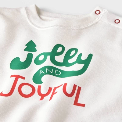 Stay in a jolly mood by dressing up your baby in the 2-Piece Jolly Fleece Graphic Top and Bottom Set from Cat & Jack™. This fleece outfit set includes a white sweatshirt with the message “Jolly and Joyful” in green and red, along with matching green pants covered with trees print for holiday appeal. Their midweight fabric feels soft and comfortable, while the full elastic waistband pants stay in place.