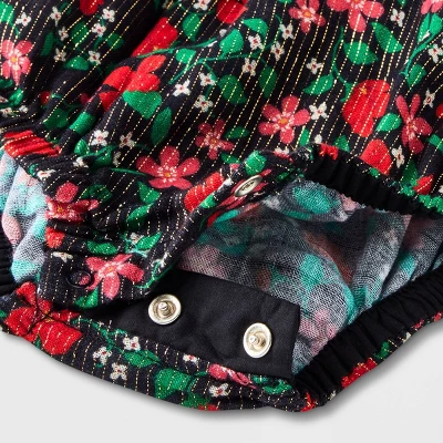 Dress up your baby in cute style with this Woven Lurex Romper from Cat & Jack™. This long-sleeve romper features vibrant floral print with metallic stripes and ruffles detailing along the neckline for sweet charm. Made from cotton-blend fabric with elastic at the leg openings, the back snap and crotch snaps allow for easy dressing and diaper changing. Have them wear the cropped romper alone or paired with a bottom for a cozy look.
