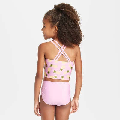 Your child will be ready for beach vacations in charming style with the Fruit Print Midkini Set from Cat & Jack™. This two-piece swimwear set includes a midkini top featuring stripes and allover pineapple print plus solid-colored boyshort bottoms for a charming look. The pieces are made from soft and stretchy fabric to offer flexibility and comfort both in and out of the water, and the UPF 50+ rated design offers them protection from the sun’s UV rays.