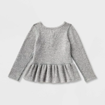 Your little one will look and feel their adorable best wearing this Adaptive Long-Sleeve Henley Peplum Shirt from Cat & Jack™. This garment is made with stretchy fabric that makes it easier to put on and more comfortable to wear. The long-sleeve peplum shirt is designed in a heathered gray hue with a round neckline and two front collar buttons. Perfect for everything from family gatherings to accompanying you on errands, the below-hip length makes it easy to pair with any of their bottoms.