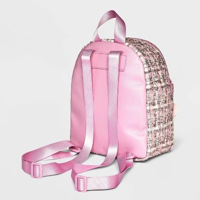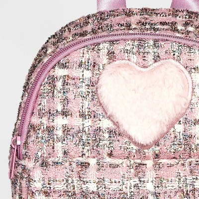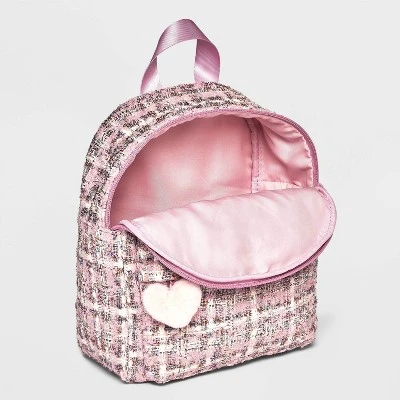 - Pink backpack in shiny plaid print and baby pink heart design