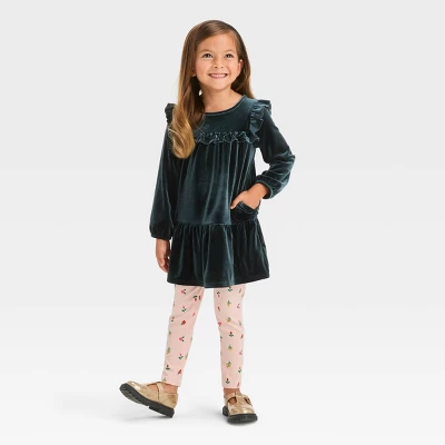 Add dressy sheen to your toddler’s look with this Solid Long-Sleeve A-Line Dress from Cat & Jack™. This black long-sleeve dress fashioned in an A-line silhouette features dressy frill details on the front and back yoke, a tiered hem and side seam pockets for functional flair. The soft velour fabric with added stretch offers them a cozy and comfortable fit, while the back keyhole button makes dressing them a breeze.